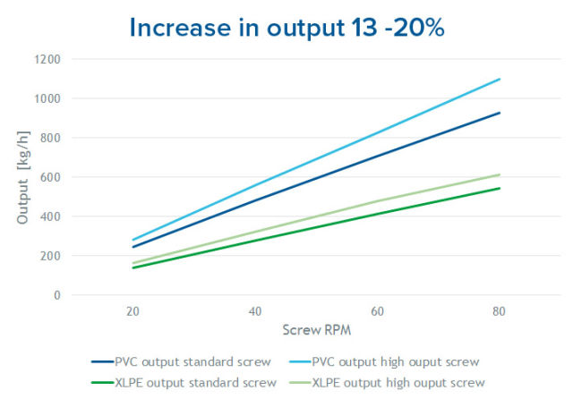 Higher throughput due to the new screw design, and improved temperature control. In addition, compared to Maillefer’s previous generation extruders, you will enjoy an increase of PVC, XLPE (silane co-polymers) and PE of up to 15 – 20%.