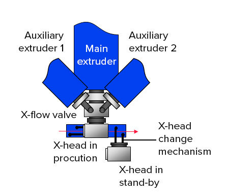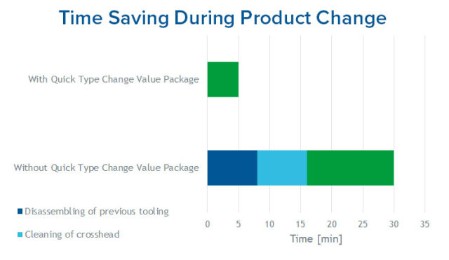 By implementing the crosshead change system, you can reduce downtime that is normally experienced between product changes.